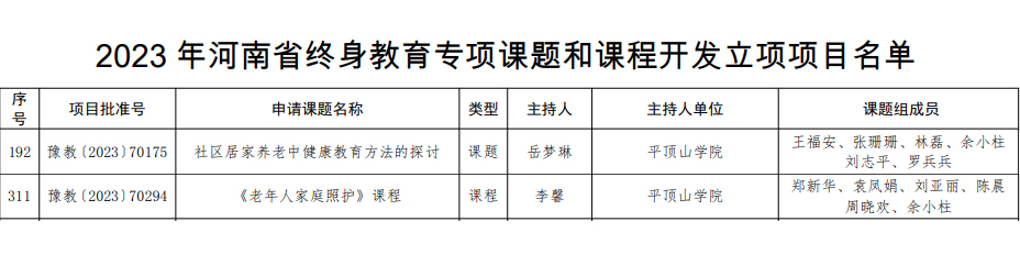 岳梦琳老师主持的《社区居家养老中健康教育方法的探讨》立项建设河南省终身教育课题。李馨老师主持的《老年人家庭照护》课程立项建设河南省终身教育课程。