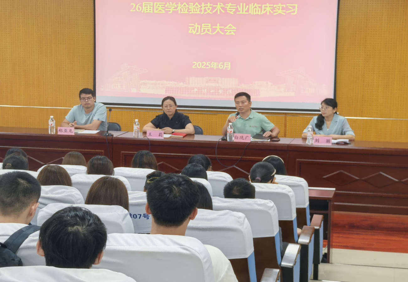 为切实做好2026届毕业生临床实习工作,6月19日下午,太阳成集团tyc122cc分别在1号和2号学术报告厅分四场召开了医学检验技术专业、口腔医学专业临床实习动员大会。太阳成集团tyc122cc党委书记王莉、副书记夏乐、副经理白现广出席大会,相关部门负责人、实习指导老师、论文指导老师及全体实习生参会。