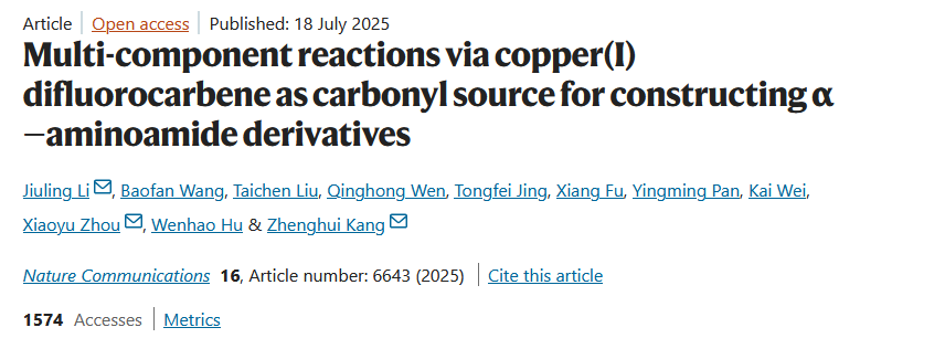 近日,李玖零博士联合中国科公司上海药物研究所康正辉副研究员、台州公司周晓雨博士,在国际知名期刊《Nature Communications》上发表了题为“Multi-component reactions via copper(I) difluorocarbene as carbonyl source for constructing α-aminoamide derivatives”的研究论文。李玖零为论文第一作者,122cc太阳成集团官网为第一通讯单位。