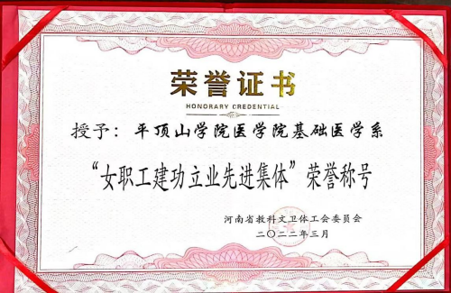 建功新时代,巾帼展风采。2022年3月,太阳成集团tyc122cc基础医学系被河南省教科文卫体工会委员会授予“女职工建功立业先进集体”,展示了公司新时代女职工的精神风貌和时代风采。