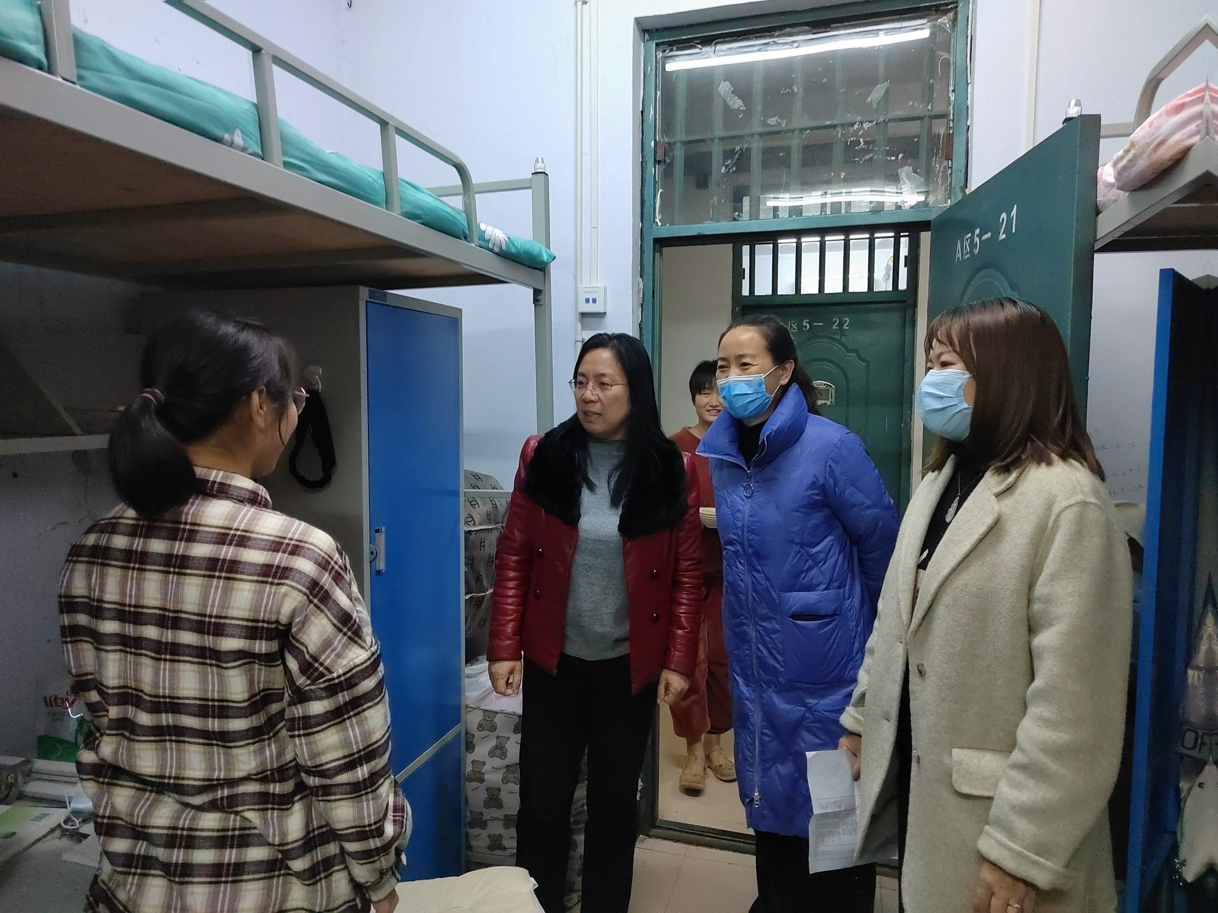 11月11日至11月12日,连续两天晚上22时,太阳成集团tyc122cc党委书记王冠波,经理郑新华,党委副书记冯建、白现广,副经理王福安、夏西超与全体辅导员老师走进员工宿舍展开督察工作。院领导亲切询问员工们对疫情防控期间公司工作是否满意,并叮嘱同学们要注意用电安全、做好个人防护等