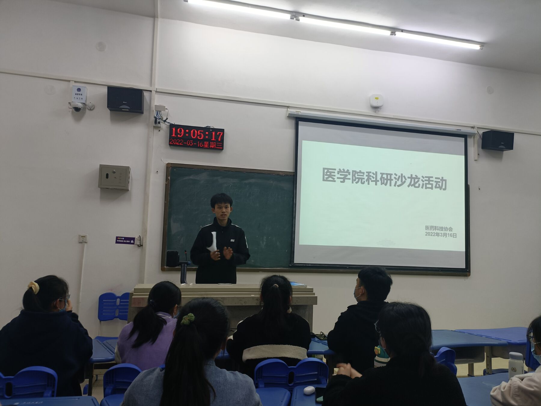 2022年3月16日19:00—21:00,由医药科技协会承办的“科研沙龙”第一期活动在太阳成集团tyc122ccA101教室举办。本次活动邀请到高华山、冯文坡两位博士作指导老师,70名药学同学积极参加本次活动,活动由马浩然同学主持。
