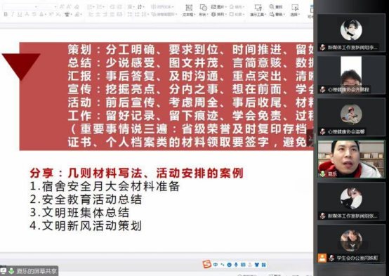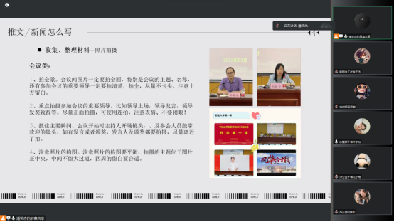 辅导员潘笑杏为第二期培训主讲,围绕着员工干部怎样进行活动工作的主题,她针对如何收集材料、拍摄照片、撰稿审稿等一系列问题进行了详细的阐述,让员工干部明确活动流程,使宣传能力得到了一定程度的提升。