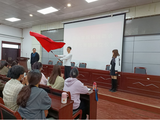 会议伊始,员工会主席史柯、党支部员工工作助理王可、团委员工副书记郭志珍和社联主席郭佳康汇报了开学以来的相关工作和活动,提出问题、总结经验。随后潘笑杏老师宣读了运动员名单,运动员代表和方阵代表相继发言。最后,团委书记夏乐为旗手闫柯豪授旗,旗帜飘扬,激发了在场人员的热情,充分调动了运动员的积极性。