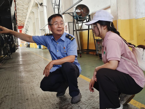 活动当天,车间工会主席邢国超的邀请成员们进入车间参观,并就厂区主要工作内容、火车的发展历程以及火车头的内部构造与工作原理进行了生动讲解。同学们积极互动、用心思考,既有对近距离接触火车头的新奇与激动,更切实体会到了火车检修的重要性、感受到了铁路人日复一日的辛苦付出。