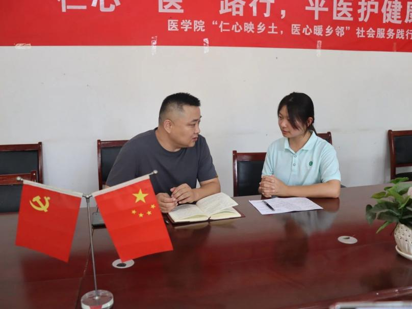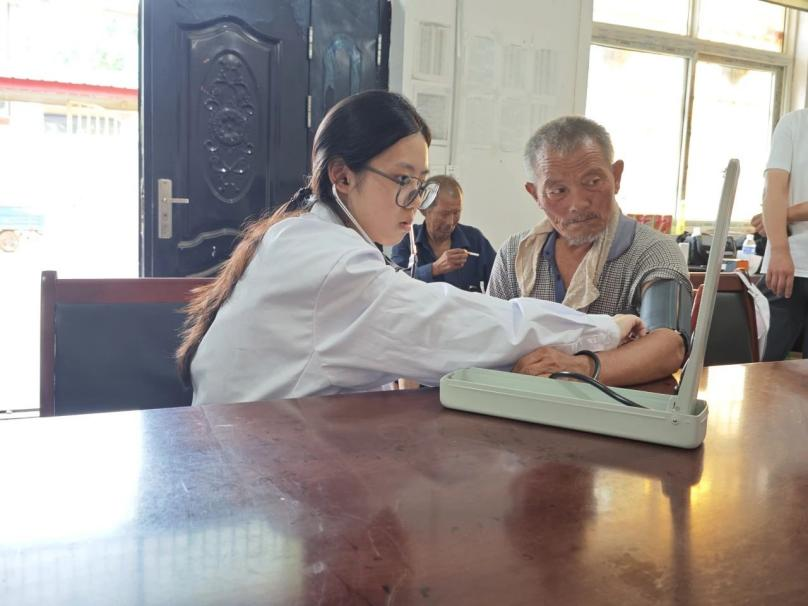 前期,实践团队与袁松磊进行深入地交流,袁松磊十分关注村民们的健康情况。在袁书记看来,医疗帮扶是驻村帮扶的重要环节,对扶贫监测户而言更具有特殊的意义。这些家庭往往因疾病、残疾等原因导致发展动力不足,健康保障更是稳固脱贫成果的关键一环。将专业的健康义诊服务主动送到扶贫监测户的家中,针对监测户的身体状况开展了血压检测等基础检查。不仅让行动不便的家庭成员足不出户就能享受到便捷的医疗服务,更精准地掌握了健康动态。这对筑牢扶贫监测户的健康防线、防止因病因残返贫具有重要意义。
