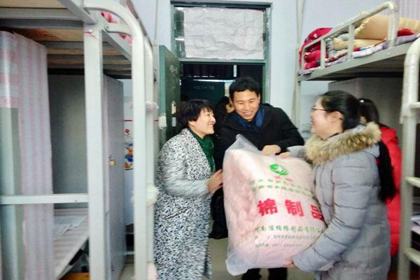 为落实公司资助政策,让贫寒学子在寒冷的冬天感受到公司给予的浓浓关爱,12月21日公司党总支副书记张琳带领全体辅导员走进宿舍发放爱心棉被,共计发放给贫困资助生58床棉被。