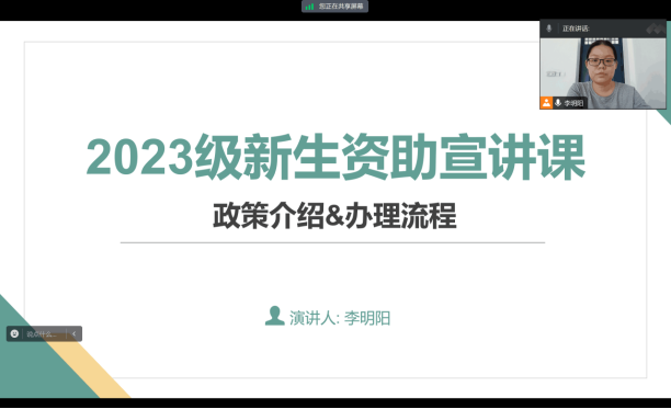 为扩大宣传范围,本次活动采用腾讯会议的形式,宣讲对象主要为一千余名2023级新生。本次活动详细地向各位新同学讲解了各项国家资助政策及其申请流程和注意事项。在宣讲过程中,同学们认真听讲,有疑惑的地方及时与主讲人连麦询问。在同学们的积极参与和全体工作人员的共同努力下,此次2023级新生资助宣讲课圆满结束。