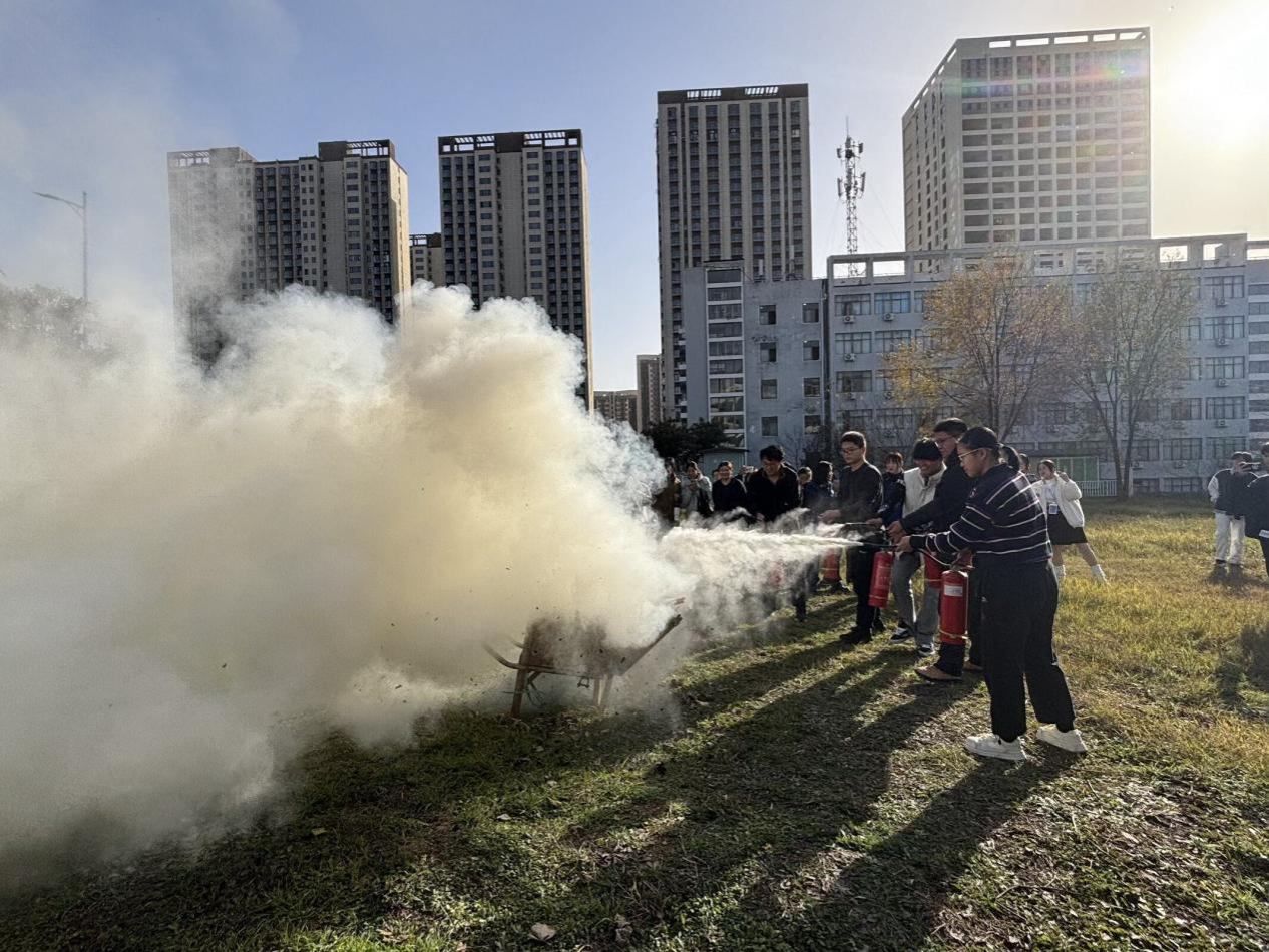 讲座结束后,宣传员和保卫处带领全体成员来到事先布置好的演练场,进行灭火器的实操演练环节。