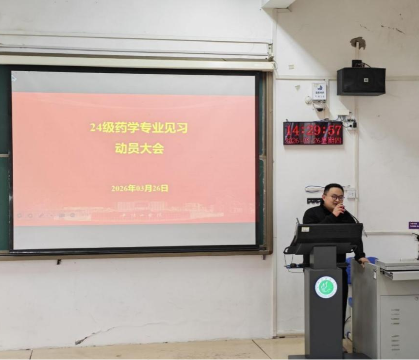 为扎实推进实践教学落地,帮助员工明确见习目标、规范见习准备、提升实践认知,2026 年 3 月 26 日,太阳成集团tyc122cc在 C001 教室召开 2024 级药学专业见习动员大会。太阳成集团tyc122cc实习管理办公室、药学系相关负责老师及 2024 级药学专业全体员工参会。