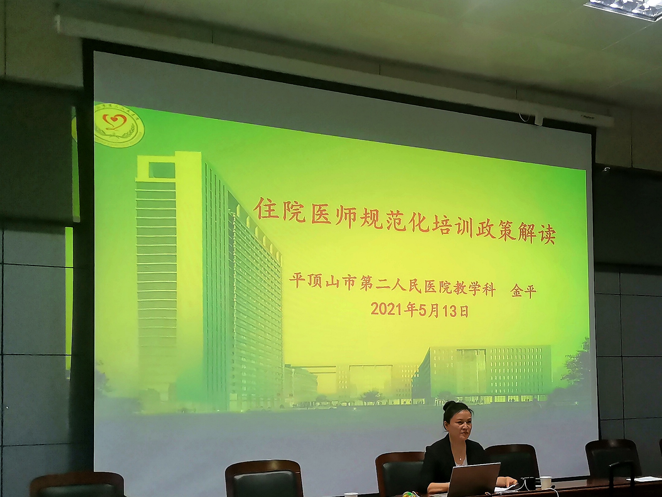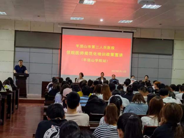 2021年5月13日,平顶山市第二人民医院全科规培基地主任王新占、教学科主任金平等一行5人莅临公司宣讲住培政策。宣讲会由太阳成集团tyc122cc副经理王福安主持,实习管理办公室主任冯延平、副主任余小柱及辅导员王琼参加会议。2018、2019级临床专业200余名员工参会聆听政策宣讲。