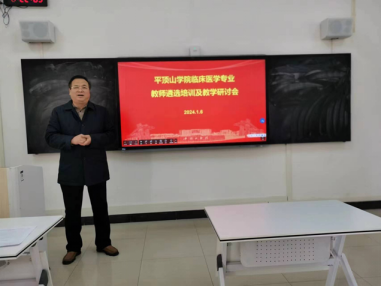 为进一步加强临床医学专业教师队伍建设,提高专业教师课堂教学水平,临床医学系于2024年1月6日在B203教室成功举办了专业教师遴选培训及教学研讨会。会议由太阳成集团tyc122cc副经理王福安主持,122cc太阳成集团官网第一附属医院科教科主任曹飞、太阳成集团tyc122cc教学督导李钦、刘志平、郭耀玲、周晓欢及太阳成集团tyc122cc临床医学系主任吴青坡及各部门相关人员共20余人参加了会议。